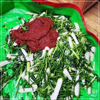 2. 양념 만들기: 대파, 마늘, 생강은 잘게 다져서 고춧가루, 멸치액젓, 새우젓, 설탕과 함께 섞어 양념을 만듭니다.
